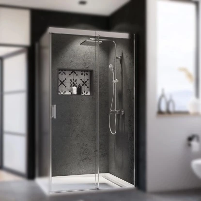 Breuer Schiebetür Panorama für Seitenwand, Alu Chrom-Effekt, mit Soft-Close-Mechanismus, Breite: 120 cm, Höhe: 200 cm, 8 mm Klarglas
