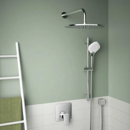 Idealrain ist ein vollständiges Brauseprogramm mit allen Komponenten zur Ausstattung eines schönen und komfortablen Duschbereichs. Dazu zählen zum Beispiel Handbrausen mit Navigo-Umschaltung und formschöne Kopfbrausen.