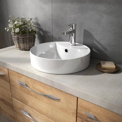 Modernes Design made in Germany: Das weißglänzende Aufsatzbecken besticht durch seine runde Form.